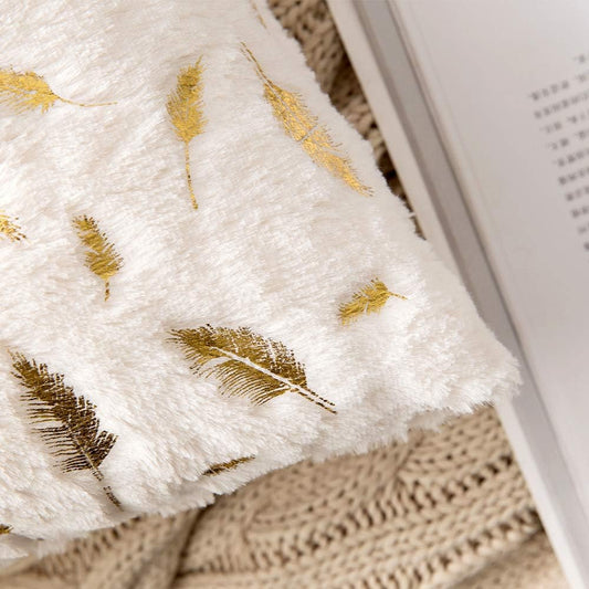 Pack of 2 Decorative Throw Pillow Covers Plush Faux Fur with Gold Feathers Gilding Leaves Cushion Covers Cases Soft Fuzzy Cute Pillowcase for Couch Sofa Bed, 18 X 18 Inch, Ivory