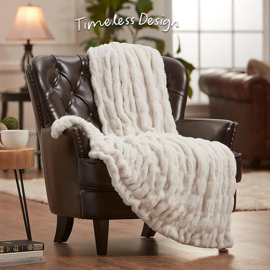 Premium Ruched Faux Fur Throw Blanket - Luxurious, Soft Reversible Mink Blanket - 50" X 65” - Cloud