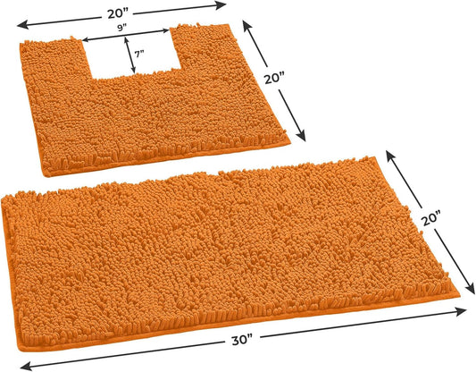 Orange Bathroom Rugs Chenille 2-Piece Bath Mat Set, Soft Plush Bath Rug +Toilet Mat.1'' Microfiber Shaggy Carpet, Super Absorbent Machine Washable - Square Curved Set (20”X 30” + 20”X20” U, Orange)