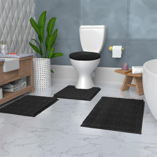 4-Piece Bathroom Rug Set - Soft Chenille Mats, Non-Slip Toilet Mat & Lid Cover for Comfort & Style (20X20 U, 16X24, 20X30 & 19X19 Inches, Black)