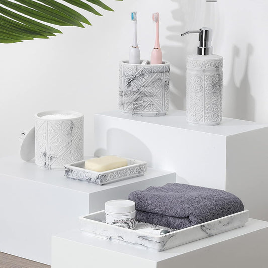 Bathroom Accessory Sets 5 Pcs, 3D Resin Vanity Tray, Toothbrush Holder Cup, Soap Dish, Cotton Swab Holder, Soap Lotion Dispenser, Home Decor Bath Counter Accessory Completes, Marble White