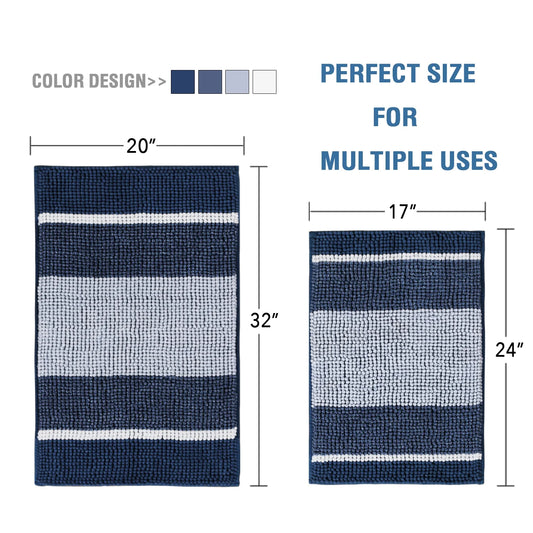 Extra Thick Chenille Striped Pattern Bath Rugs for Bathroom Non Slip - Soft Plush Shaggy Bath Mats for Bathroom Floor, Indoor Mats Rugs for Entryway (Navy, 32 X 20 plus 24 X 17 - Inches)