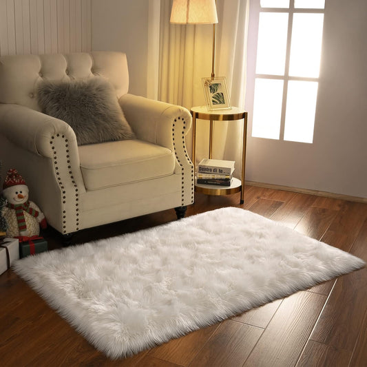 Fluffy Faux Fur Sheepskin Rugs Luxurious Wool Area Rug for Kids Room Bedroom Bedside Living Room Office Home Decor Carpet (3Ft X 5Ft, White)