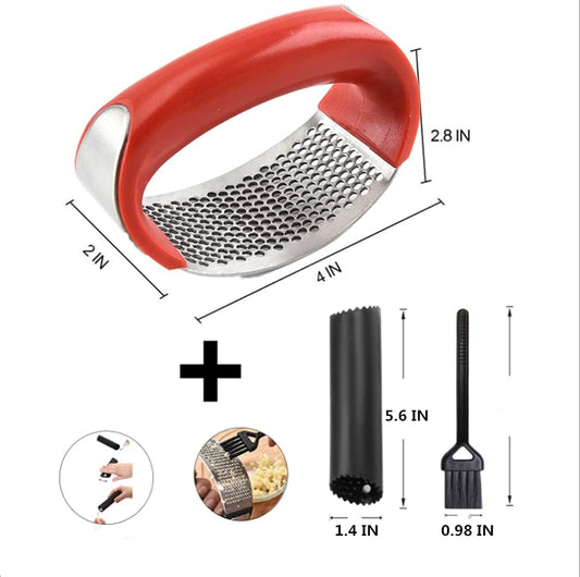 Garlic Press, Garlic Press Stainless Steel, Garlic Press Rocker Garlic Peeler Set Cleaning Brush Kitchen Garlic Chopper Press Rocker Easy Operate and Clean Kitchen Tools (Red)