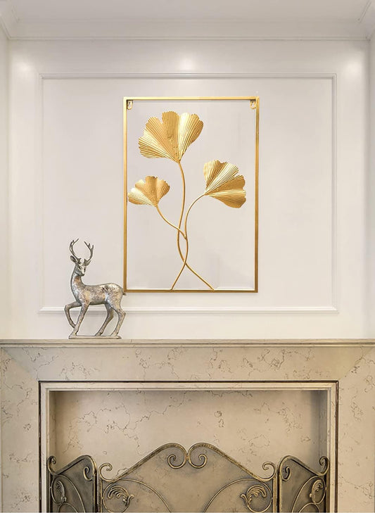 Gold Metal Wall Decor, 24" X 16" Gold Leaf Wall Decor with Frame, Golden Metal Ginkgo Leaf Wall Art Wall Sculpture for Living Room, Office, Home, Hotel