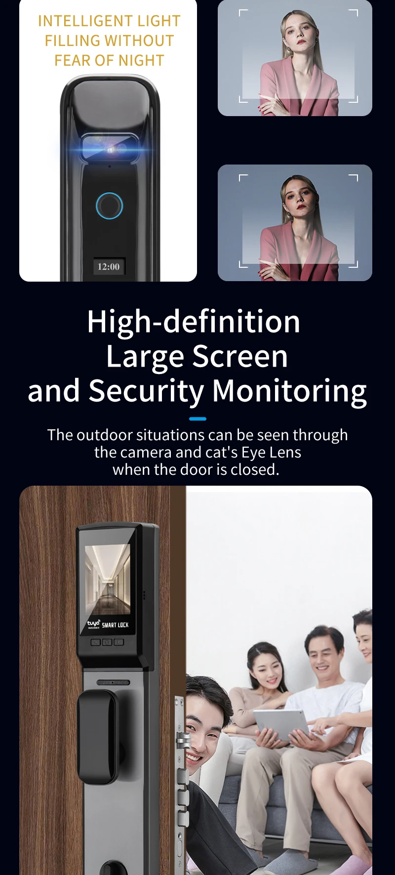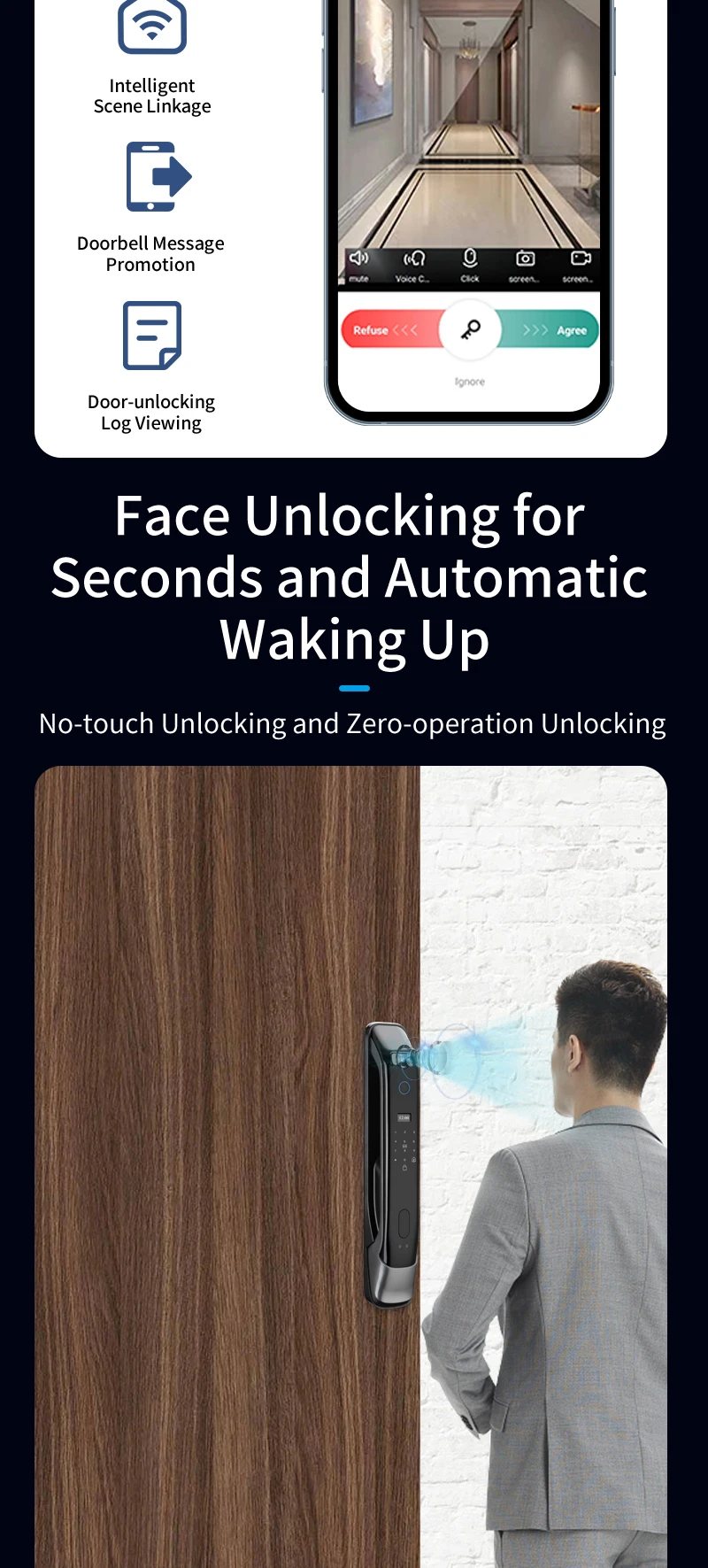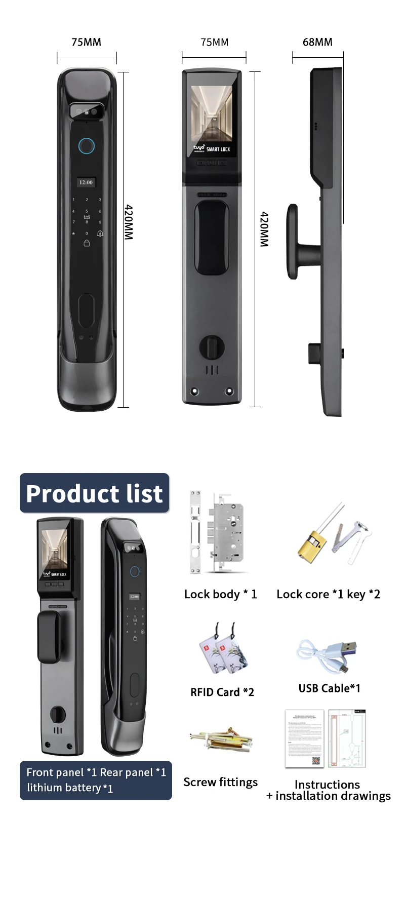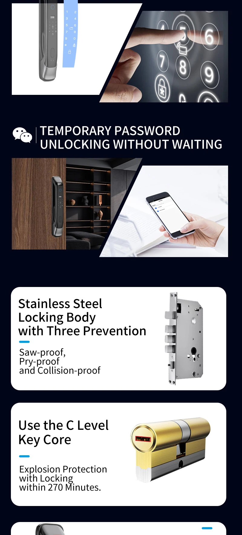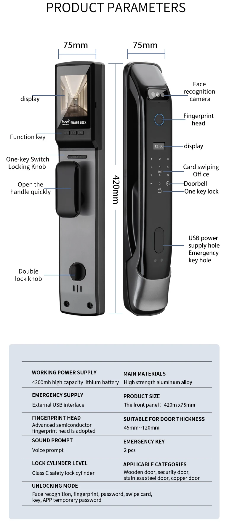1. Multi-modal Unlock Options: This smart door lock offers versatile access methods including facial recognition, password, fingerprint , card, key, and temporary password, ensuring secure and convenient entry for users.