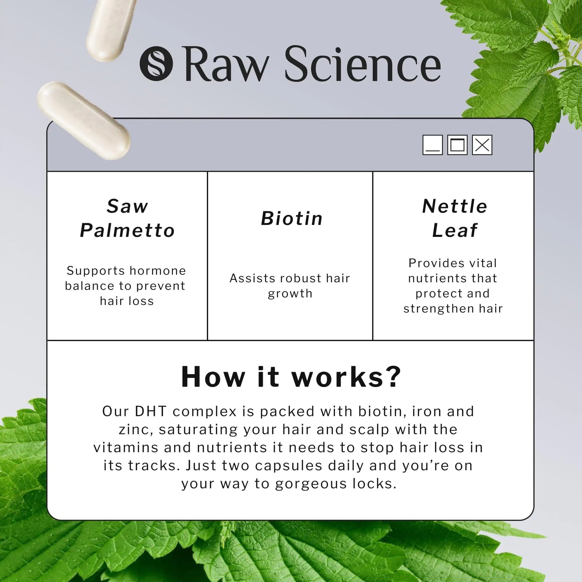 HAIR VITAMINS A dash of Iron, Biotin and Saw Palmetto in every bottle of DHT blocker pills helps promote keratin production to get your hair growth back on track. Try our advanced biotin DHT blocker with Stinging Nettle, Horsetail Herb, Wu Tang today.