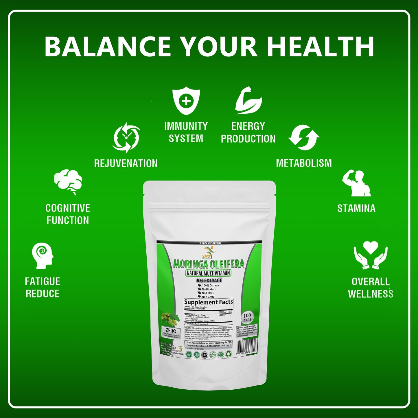 1 BAG = TOTAL 100 CAPSULES 100 MAXIMUM STRENGTH 500mg CAPSULES PER SEALED BAG Moringa Oleifera 100 Capsule Bag. Our Moringa Oleifera 10:1 Extract contains a super high-potency extract of Moringa Oleifera standardized for 10:1 concentration and is lab tested for potency and purity.In order to provide consistency in quality, all of our products undergo following tests:Assay with HPLC / Titration / Gravimetry, Residual Solvent Analysis with GC-HS, Heavy Metal Testing with AAS, Microbiology Analysis, Impurity Profiling and Stability testing HIGHEST PURITY: Our products contain zero magnesium stearate, synthetic ingredients, dioxides, anti-caking agents, preservatives, colors or flavors. There are zero unnatural potentially harmful synthetic or artificial ingredients of any kind. NON SYNTHETIC: This product contains zero synthetic ingredients. It is sourced and made from real plant material and contains zero lab made or synthetic ingredients. 100% REAL HERBS! Quantity: 1 Bag = 100 Capsules Recommended dosage: Take 2 capsules daily, ideally with food. (500mg) 10:1 Extract Per Capsule Leaf Powder Adults, take 500mg twice daily or as directed by your physician (Please consult a doctor to find out the correct dosage for your body weight and type) as a dietary supplement.